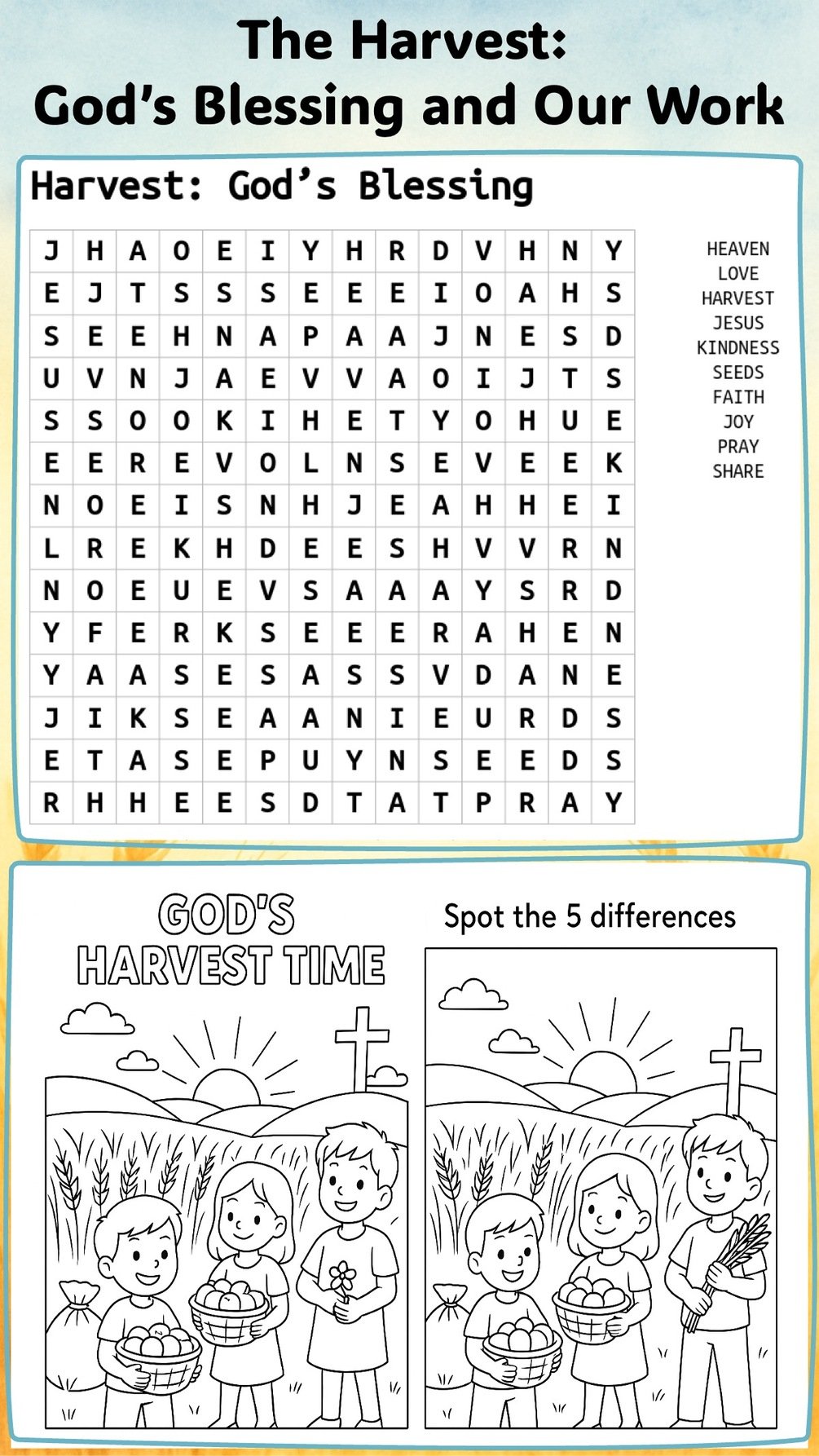 This 4-page Harvest Bible Lesson Pack is designed to help kids explore God’s blessings and their role in His work—through watercolor illustrations, devotions, and interactive activities.